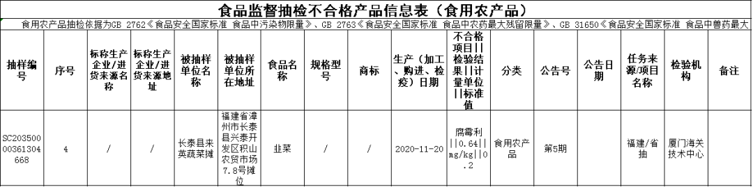 长泰县来英蔬菜摊销售的韭菜(购进日期为2020年11月20日),腐霉利不合格,检验机构为厦门海关技术中心;