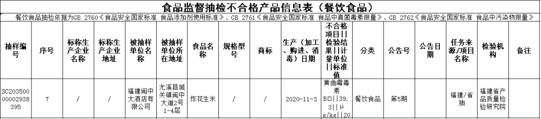福建闽中大酒店有限公司销售的炸花生米(加工日期为2020年11月3日),黄曲霉毒素B₁不合格,检验机构为福建省产品质量检验研究院。