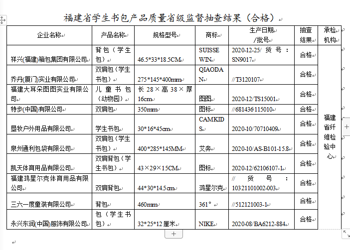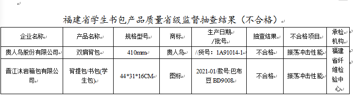 近期,依据《中华人民共和国产品质量法》,福建省市场监督管理局组织对学生书包、学生文具开展产品质量省级监督抽查,共抽查学生书包12家生产企业12批次产品,不合格2批次,不合格发现率为16.67%;抽查学生文具15家企业15批次产品,不合格1批次,不合格发现率为6.67%。