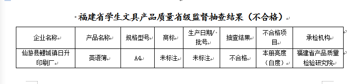 本次学生文具抽查依据GB 21027-2007 《学生用品的安全通用要求》标准要求,对学生文具的可迁移元素的最大限量、笔的上帽安全、本册亮度(白度)、边缘尖端等项目进行检验。抽查发现有1批次产品不符合标准规定,不符合项目为本册亮度(白度)。