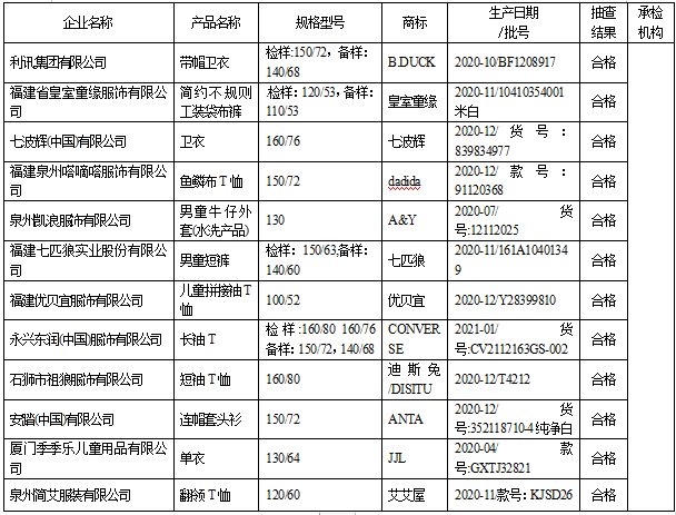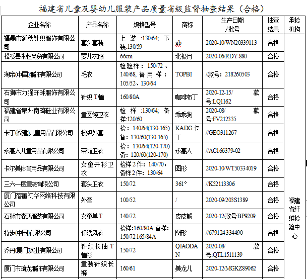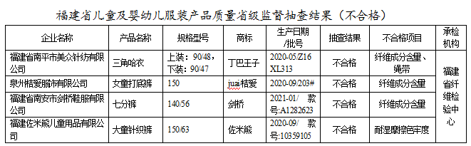 近期,依据《中华人民共和国产品质量法》,福建省市场监督管理局组织对学生服装、儿童及婴幼儿服装、童鞋开展产品质量省级监督抽查,共抽查学生服装40家生产企业40批次产品,不合格2批次,不合格发现率为5%;抽查儿童及婴幼儿服装30家生产企业30批次产品,不合格4批次,不合格发现率为13.33%;抽查童鞋30家生产企业30批次产品,不合格6批次,不合格发现率为20%。