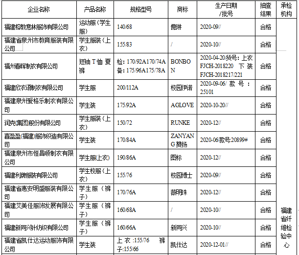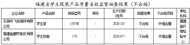 本次抽查学生服装依据GB 18401-2010 《国家纺织产品基本安全技术规范》、GB 31701-2015《婴幼儿及儿童纺织产品安全技术规范》、GB/T 31888-2015 《中小学生校服》等标准的要求,对甲醛含量、pH值、可分解致癌芳香胺染料、耐水色牢度、耐汗渍色牢度、耐干摩擦色牢度、纤维成分含量、耐皂洗色牢度、接缝强力、纰裂/接缝处纱线滑移等10个项目进行了检验。抽查发现有2批次学生服装产品不符合标准的规定,不符合项目为纤维成分含量。