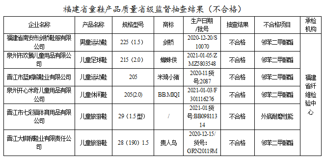 本次抽查童鞋依据GB 30585-2014 《儿童鞋安全技术规范》、QB/T 2880-2016《儿童皮鞋》、QB/T 4331-2012 《儿童旅游鞋》,儿童旅游鞋对帮底剥离强度或底墙与帮面剥离强度、外底耐磨性能、外底硬度、物理机械安全性能、皮革和毛皮中的六价铬等11个项目进行了检验;儿童皮鞋对耐磨性能、剥离强度、外底硬度等16个项目进行了检验。抽查发现有6批次儿童鞋产品不符合标准的规定,不符合项目为邻苯二甲酸酯、外底耐磨性能。