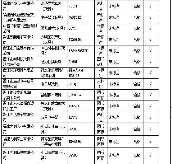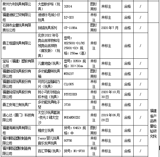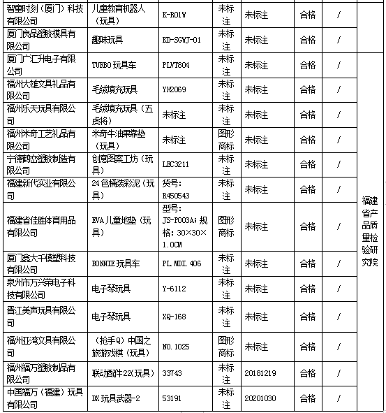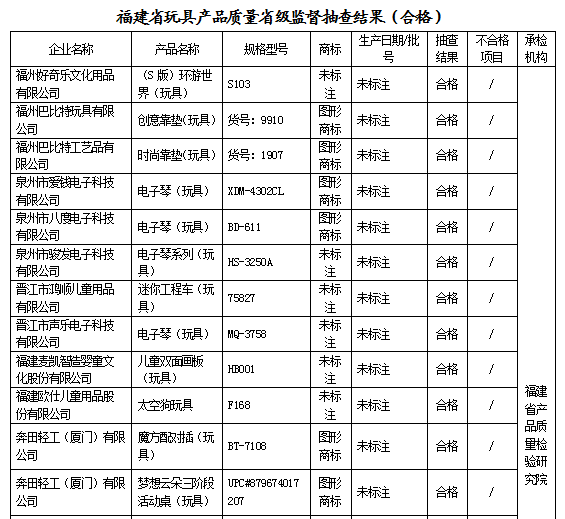 近期,依据《中华人民共和国产品质量法》的要求,福建省市场监督管理局组织对玩具、童车开展产品质量省级监督抽查,共抽查玩具65家生产企业75批次产品,不合格4批次,不合格发现率为5.3%;抽查童车16家生产企业20批次产品,合格20批次,未发现不合格。